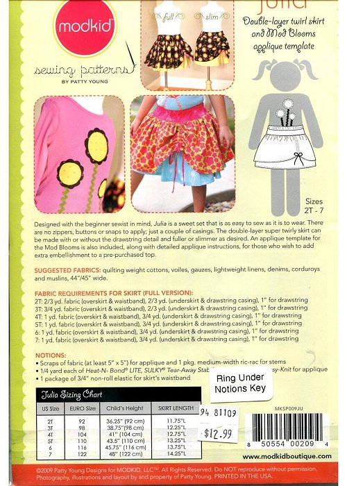 Julia' is a double layer twirl skirt designed by Patty Young. This pattern can be made in several different styles and it is very easy to make.