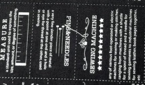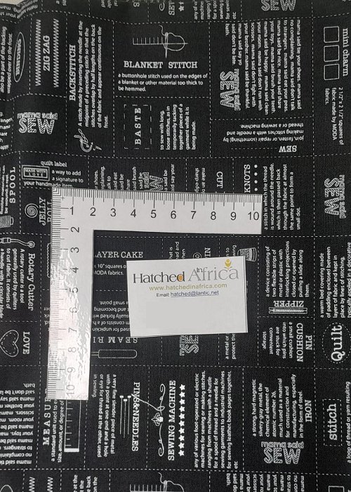 Fun fabric for every seamstress! This fabric has sayings and sewing definitions printed on. All in neat label style pattern.1 Yard100% Quilters Cotton----------------------------------1yd = +/- 90cm