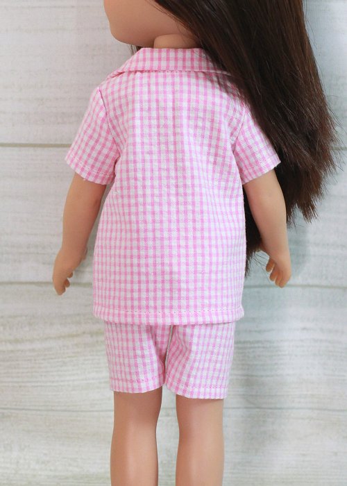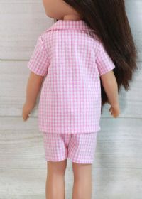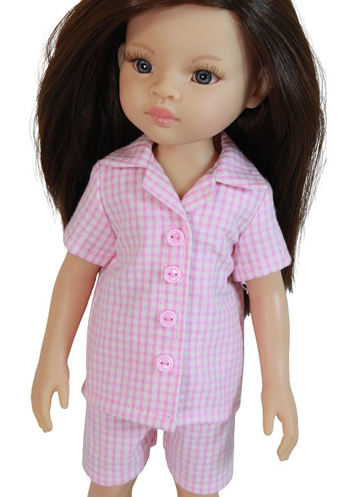 Sweet pajama set for smaller dolls. The top closes with velcro in the front. The shorts have an elastic waist for easy dressing.