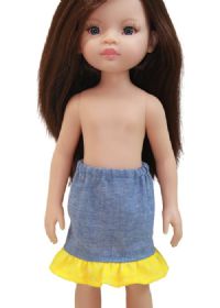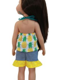 Sweet pineapple set for smaller dolls. The halter top ties with ribbon at the back of the neck. The skirt has an elastic waist for easy dressing.
