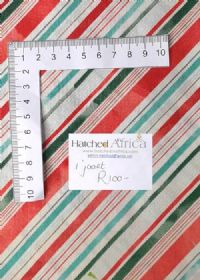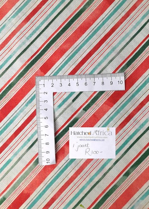 Festive stripes in turquoise, red and green on a white background. The stripes are diagonally placed accross the grain and various widths to add interest.1 Yard100% Quilters cotton--------------------------------------1 Yard = +/- 90cm