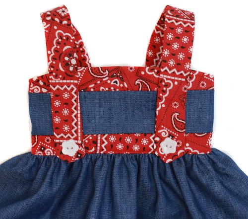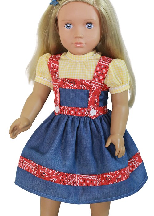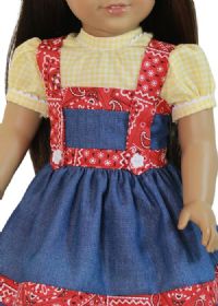 Country style denim dress with red trim and straps. Included is a yellow check blouse that closes with velcro in the back.