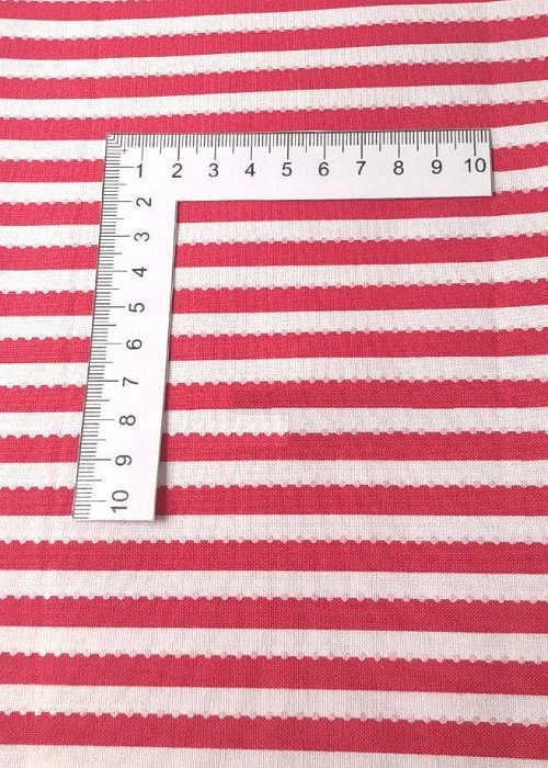 Red scallop shaped stripes on a white background. The stripes run vertically with the fabric grain.