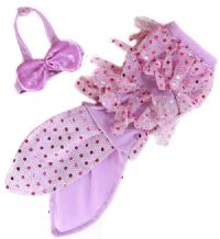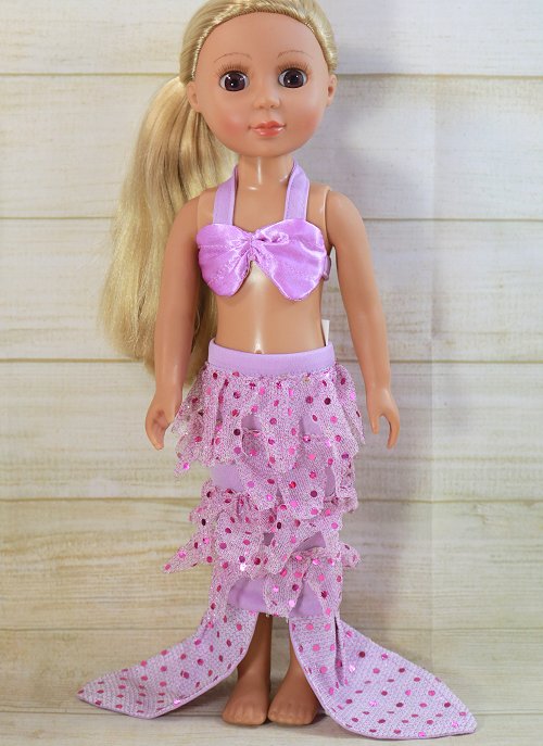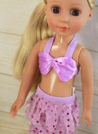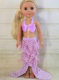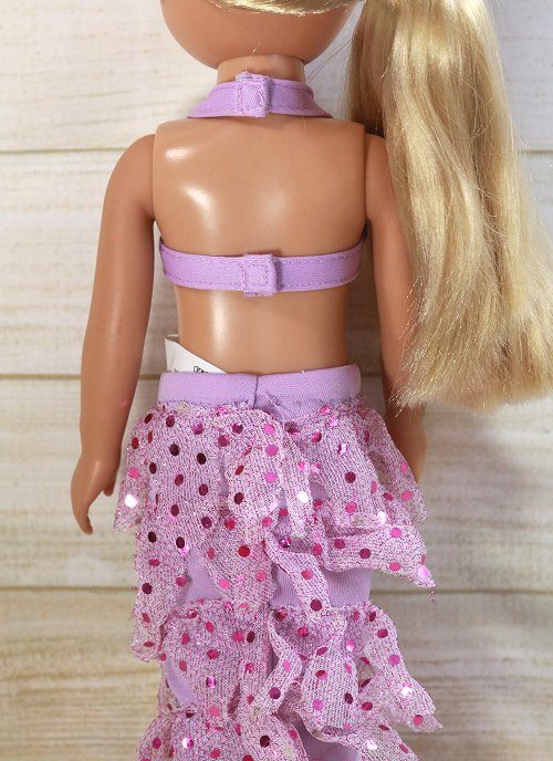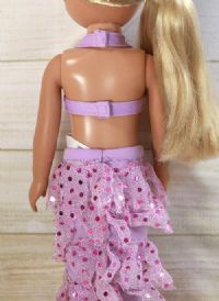 Sweet set for your smaller 14 inch doll. It includes a ruffled skirt with mermaid tail edge and a matching bikini top. The top closes with Velcro.