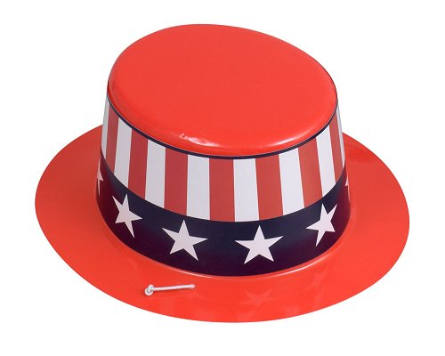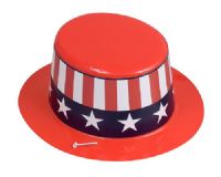 Plastic party hats in the shape of a top hat with a printed paper ribbon wrapped around which can be removed.