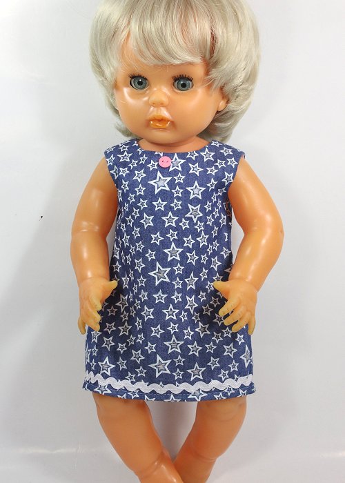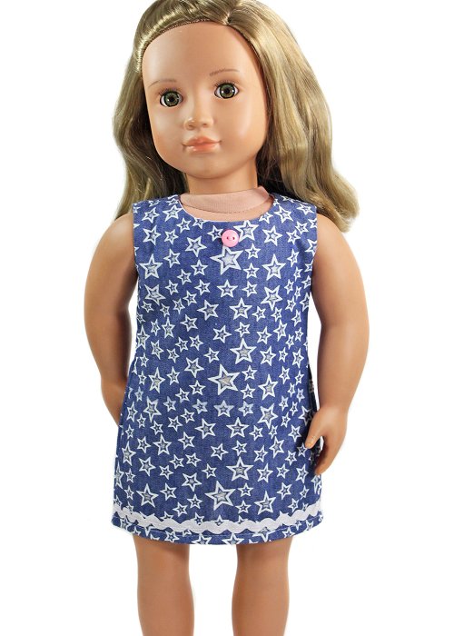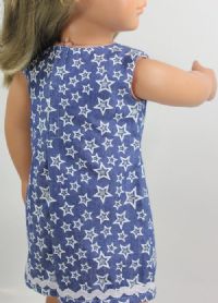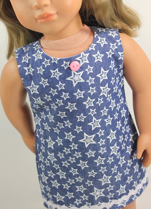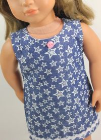 Light denim slip dress with the cutest little stars. White ric-rac detail and a pink button adds cute flair! The dress closes with soft Velcro in the back.
