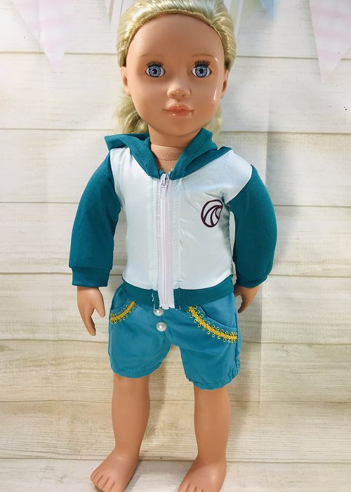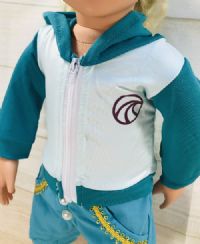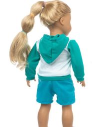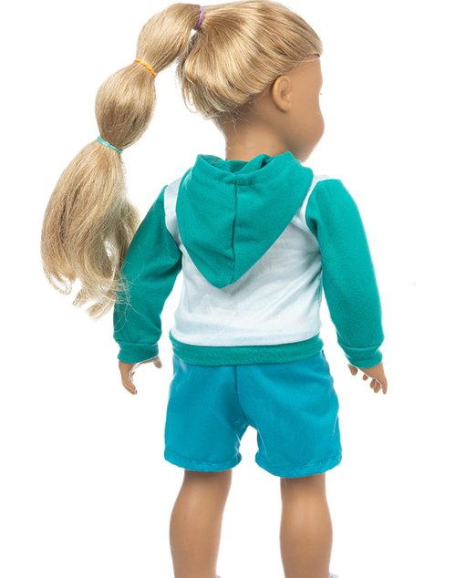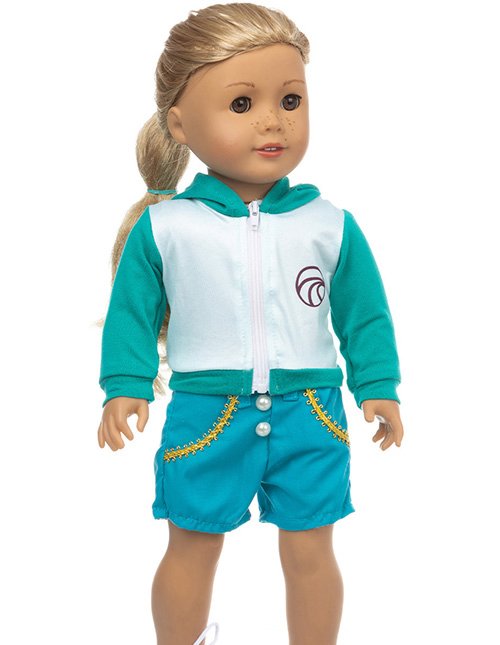 Turquoise green hoodie that closes with a zipper in the front. Included in the set is a blue shorts with yellow trim.