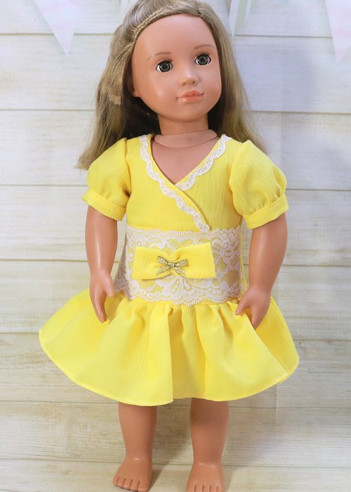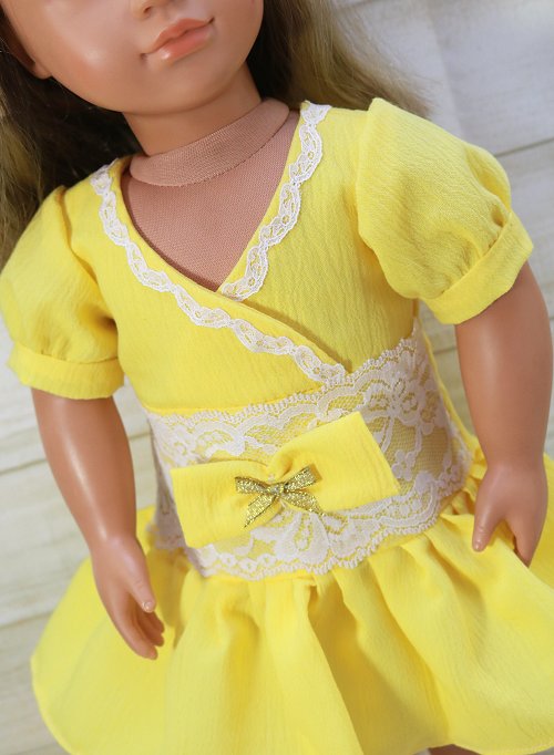 Delightful summer dress in a vibrant yellow. The low drop waist is finished with a big bow for added flair!