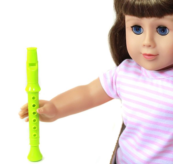 The flute is made of plastic and can really whistle if you blow into it. I use a small rubber elastic to keep the recorder in the doll's hand.
