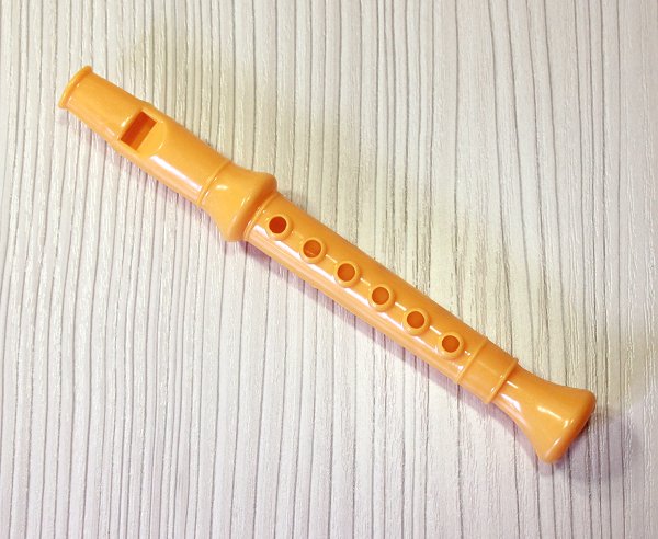 The flute is made of plastic and can really whistle if you blow into it. I use a small rubber elastic to keep the recorder in the doll's hand.