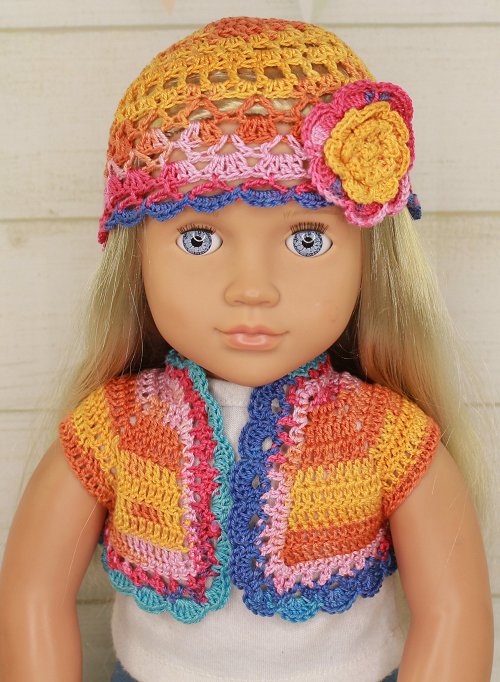 Gorgeous lace crochet set for dress up fun!Set includes:* Beanie - Finished with a flower* Crop JacketFits 18 inch dolls such as Our Generation and American Girl