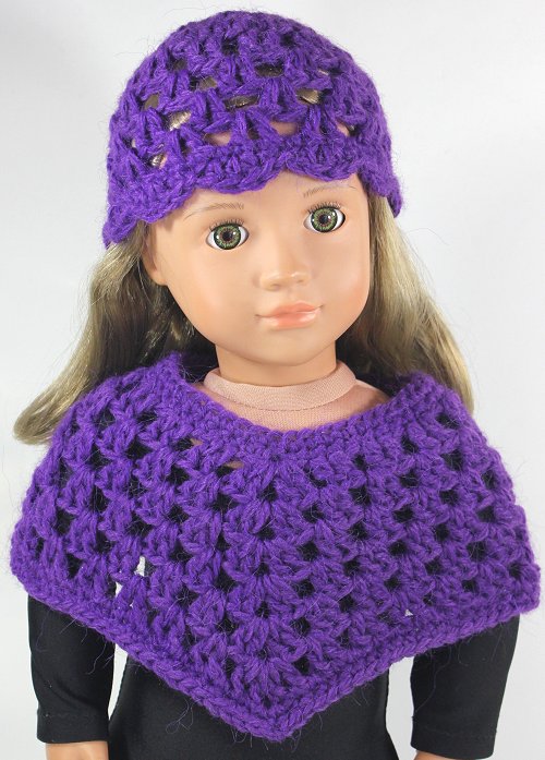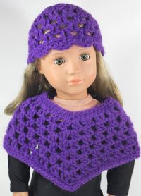 Fun and Trendy crochet poncho with a matching beanie. The matching beanie is a skull cap style beanie.Fits 18 inch dolls and slim dolls.