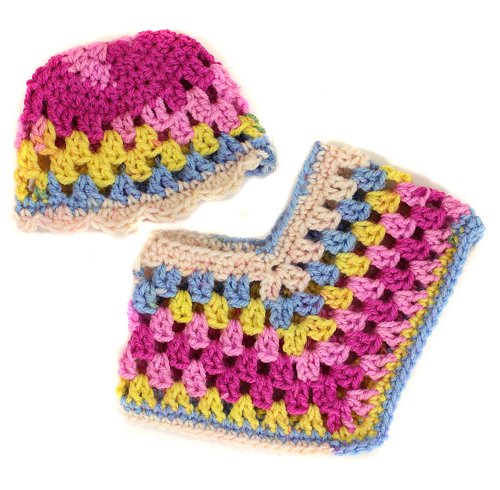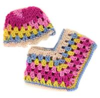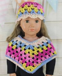 Trendy crochet poncho with a matching beanie. The poncho pulls over the doll's head for easy dressing.