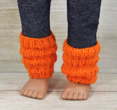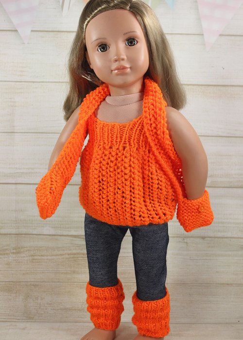 Bright and fun set that includes a cute bubble shape summer top with button closure in the back. The dark blue denim look leggings have an elastic waist. Accessories include orange leg warmers and a scarf with pockets on both ends.