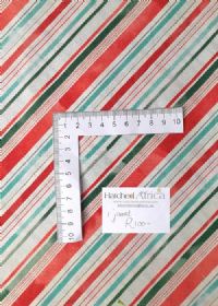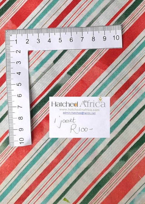 Festive stripes in turquoise, red and green on a white background. The stripes are diagonally placed accross the grain and various widths to add interest.1 Yard100% Quilters cotton--------------------------------------1 Yard = +/- 90cm