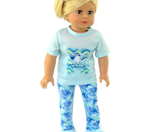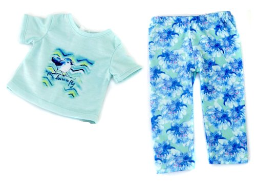 Turquoise pajamas with pretty birds and flowers. Includes a tee and pajama pants.