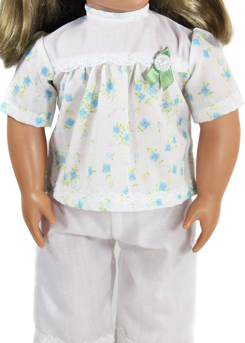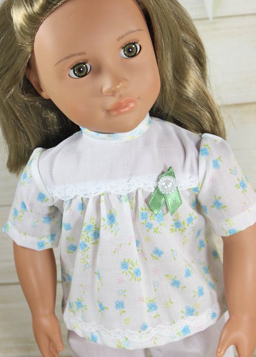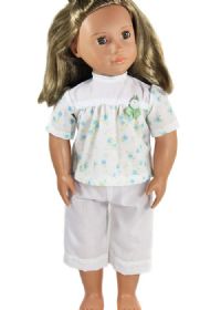 Summer play set or pajamas made from a light weight polycotton fabric. Has a ribbon and decorative button on the front for decoration. Closes with Velcro in the back.