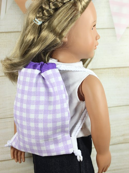 Lilac check drawstring bag for your 14 to 18 inch doll! These bags are super for everyday or sleepovers!