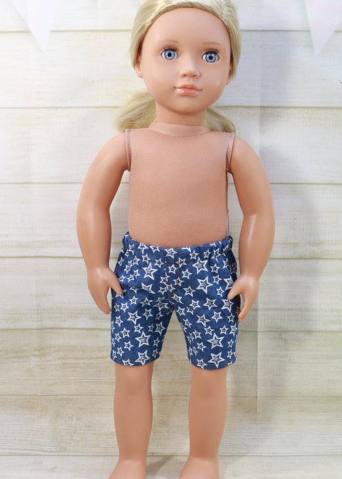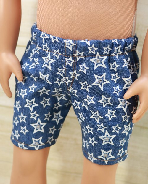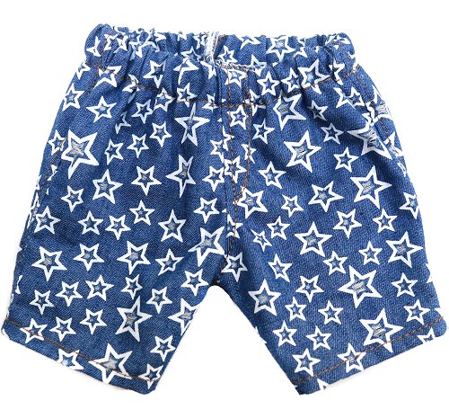 Denim shorts with an elastic waist for easy dressing. Has a fake zipper opening in the front  and top stitch on the side seams to look like a real denim shorts.