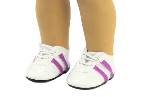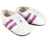 White tekkies with purple stripes on the sides. They have elastic ties over the front of the foot so easily slip onto the doll's foot.