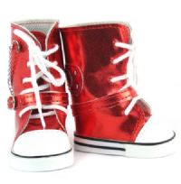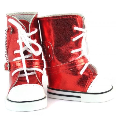 Metallic vinyl knee high boots in red with decorative chain. Opens with laces in the front.