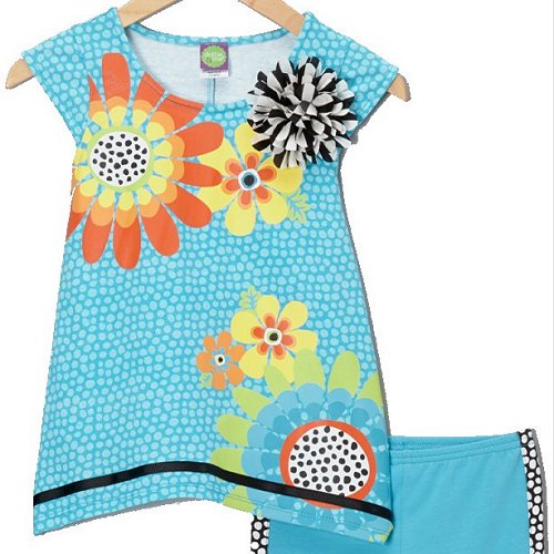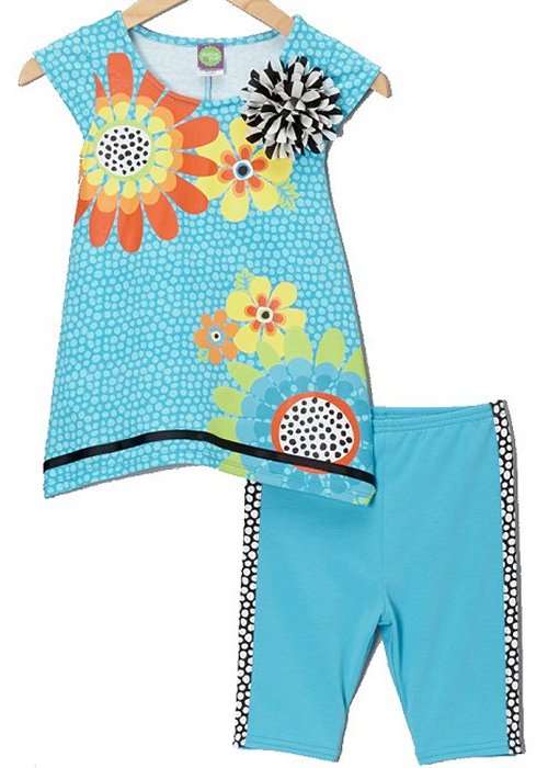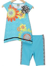 Turquoise top with orange and yellow flowers. Matching shorts completes the set.