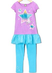 Blue leggings complete the set.