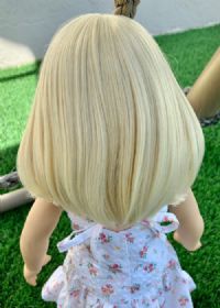 Bob length blonde hair. It is nice and thick and silky.
