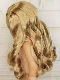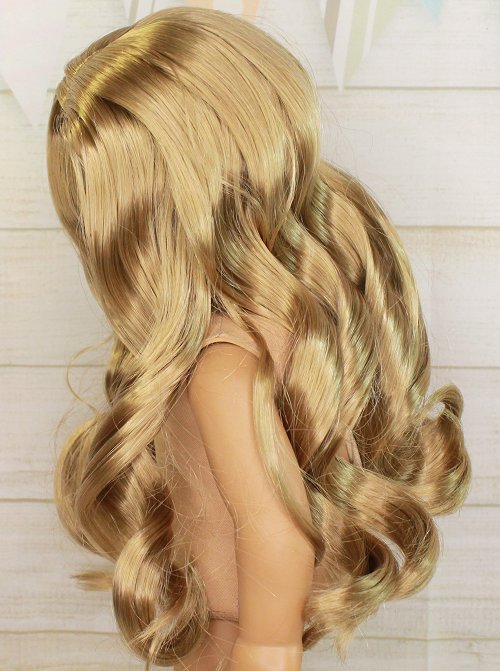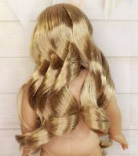 Long length, dark blonde, curly hair. No bangs so you can fit the wig with the path in the center or to the side.