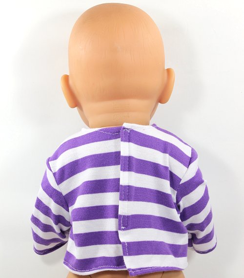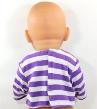 Set includes a purple stripe t-shirt with Velcro closure in the back for easy dressing. The dungarees are made from a firm fabric and closes with Velcro tabs at the shoulders for easy dressing. The pants are large enough for a nappy to be worn underneath.