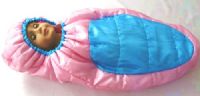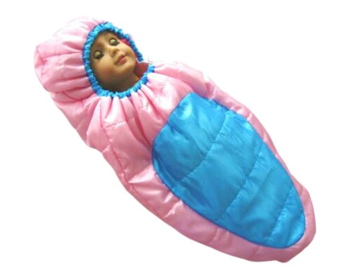 Perfect for camping or a night out! This sleeping bag is pink and blue and has a zipper closure on the side.