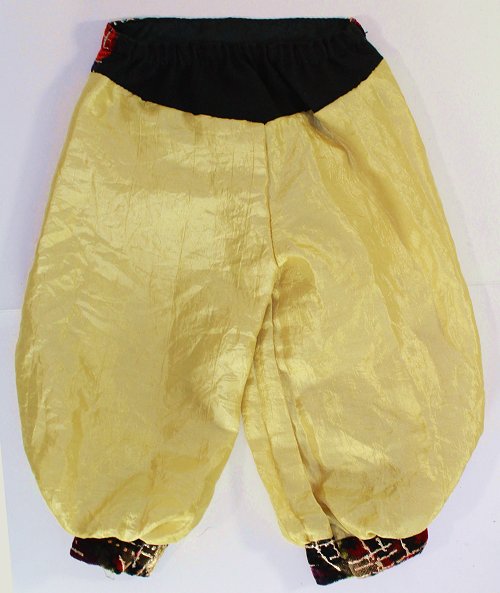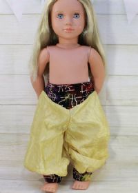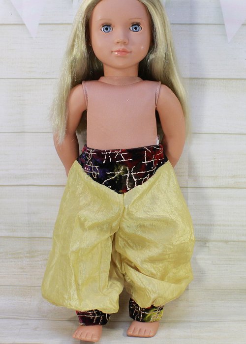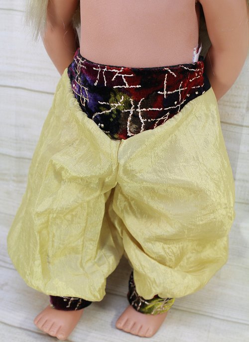 Jasmine pants for your fantasy doll. They are made from a lovely gold fabric and velvet at the waist. They are nice and full!