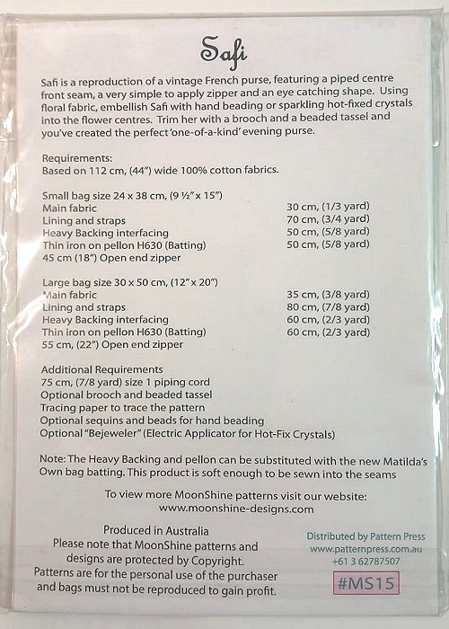The Safi pattern by Monica Poole is a reproduction of a french purse with a piped center front seam and an easy to apply zipper. Beads & crystals can be applied to make this style your own!