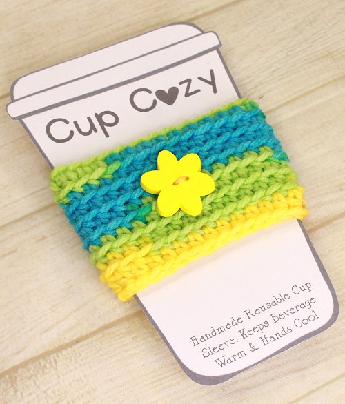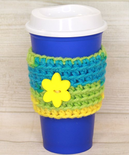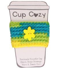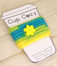 Coffee Cup Cozy made for take-away style cups. Made from a soft yarn and easily stretches to fit a variety of sizes. The Button adds some cheerful flair!