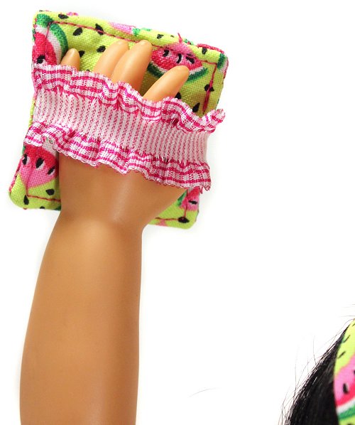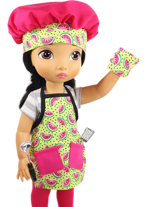 The perfect baking or cooking set for your Animator doll. The apron closes with a snap at the back of the neck and ties at the waist. The potholder has a pretty elastic that keeps it on the doll's hand.