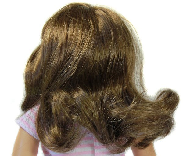 Brunette / Brown wig with Bangs (Fringe). The wig is high back length and has wavy hair.