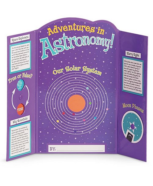 * Science-project display board with fun astronomy facts and a true-or-false spinning wheel game to play, along with a moon-phases wheel