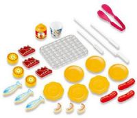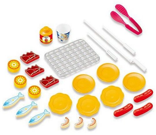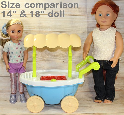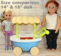 This toy BBQ set is made by Jeronimo. It is the perfect size for our dolls to play with. The cart itself is suitable for 14 to 18 inch dolls although the dolls are taller the overall scale works. See the pics below.