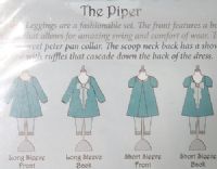 Dress and leggings are a fashionable set. The front features a box pleat down the middle that allows for amazing swing and comfort of wear. The boat style neckline has a sweet peter pan collar. The scoop neck back has a show stopping bow with ruffles that cascade down the back of the dress. Short or long puff sleeves.