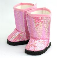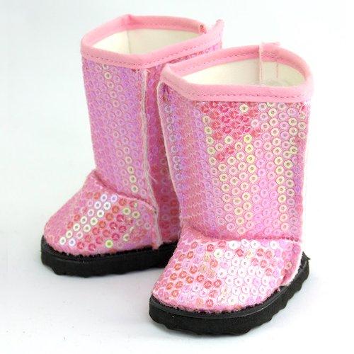 Candy pink sequin boots that slip on and off the dolls foot. The boots have a velcro closure in the back for easy dressing.