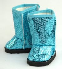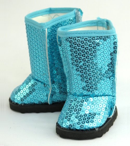 Turquoise blue sequin boots that slip on and off the dolls foot. The boots have a velcro closure in the back for easy dressing.