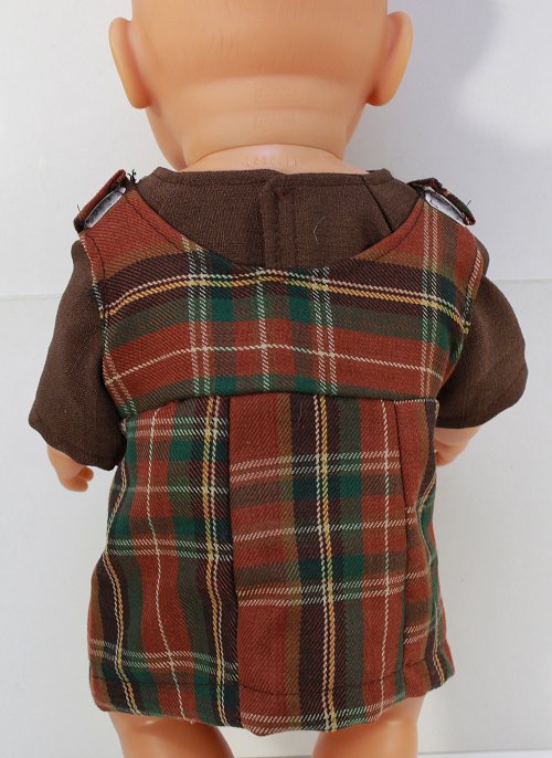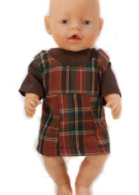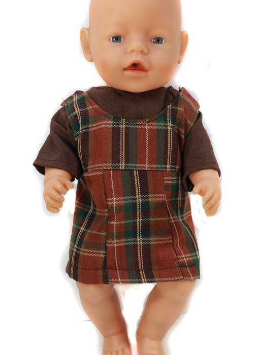 Plaid pinafore dress with Velcro closure on each shoulder for easy dressing. Included is a brown fabric top with a Velcro closure in the back.