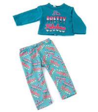 Bright colours on a lovely dark turquoise makes this outfit stand out. Consists of a top with Velcro closure in the back and pants with elastic waist.