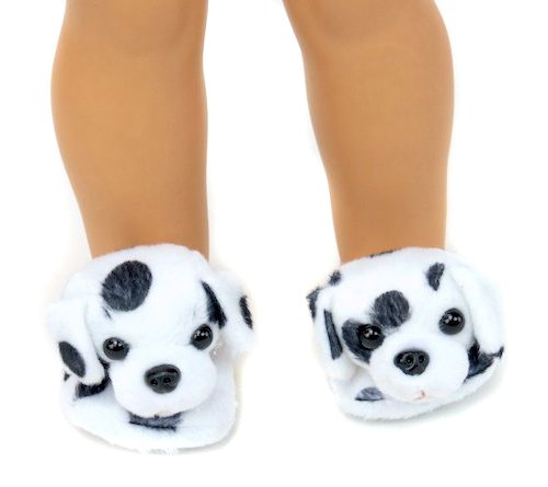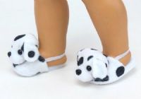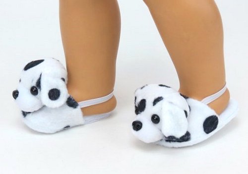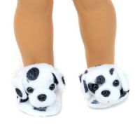Dalmation slippers for bedtime cuteness! These slippers are slip on with an elastic around the back of the doll's ankle.Fits 18 inch dolls such as Our Generation, American Girl and more.Made in China