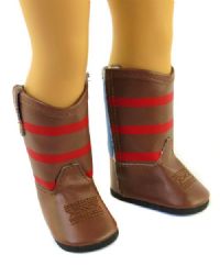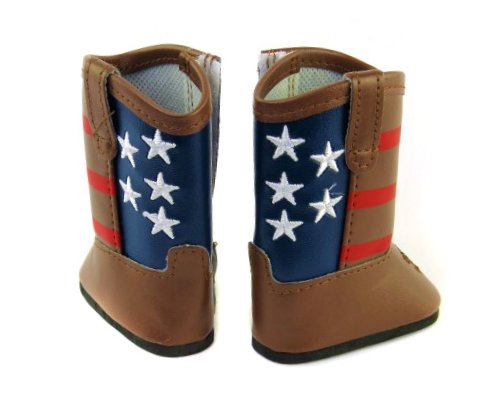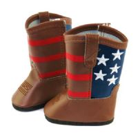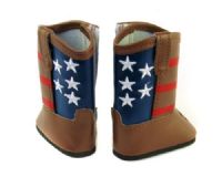 Leather look cowboy or cowgirl boots with stars and stripes. They close with Velcro on the insides for easy dressing.