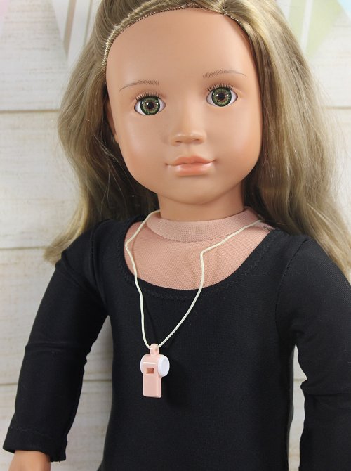 Small little whistle for your 14 to 18 inch size doll. Whistle comes attached to the elastic cord that easily goes over the doll's head.