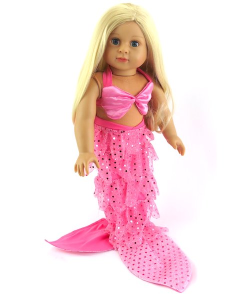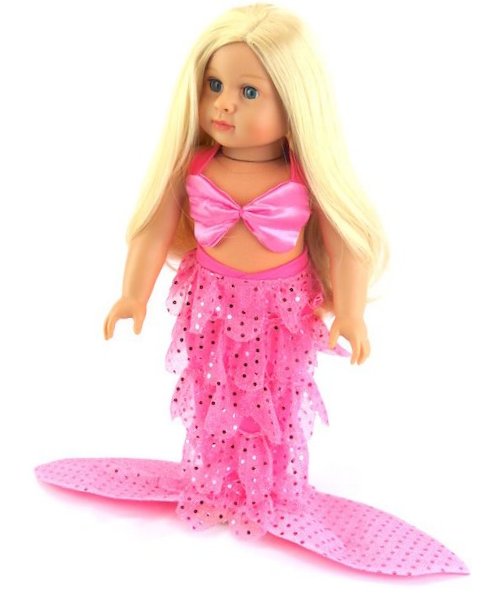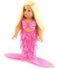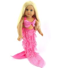 Fun mermaid set with pink sequins. The set includes a tail with ruffles that the doll can stand in. Also a cute shell shaped bikini top that uses Velcro for closure so no tying of straps is needed.