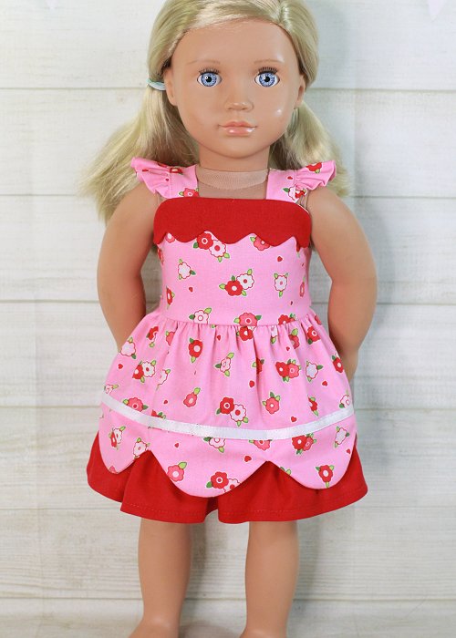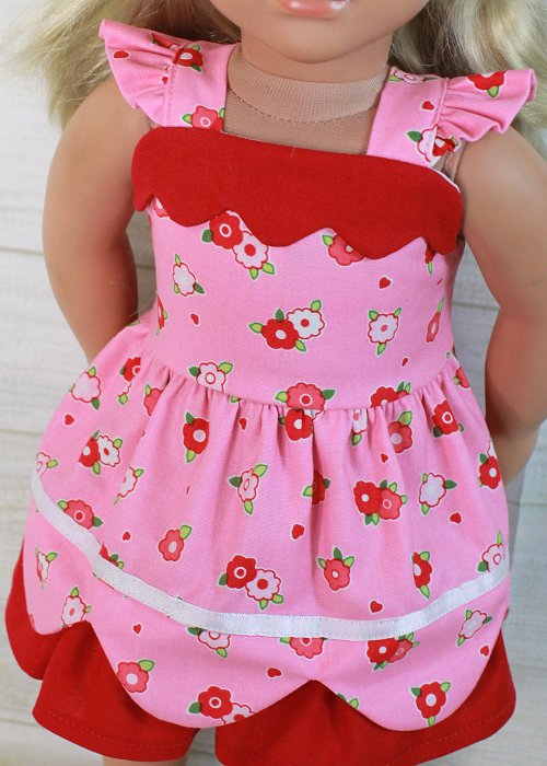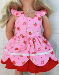 Sweet dress with flutter sleeves and a scallop trim in the front. The candy pink dress had red flowers and skirt ruffle. The scallop skirt adds pretty flair.