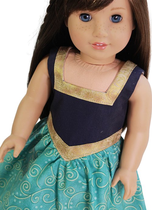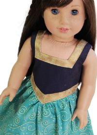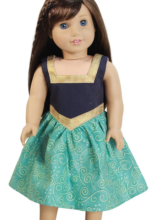 Delightful turquoise and navy dress with v-waist and square neckline detail. The bodice is fully lined and closes with velcro in the back.