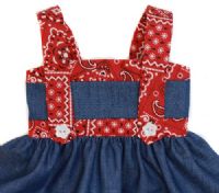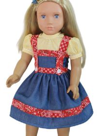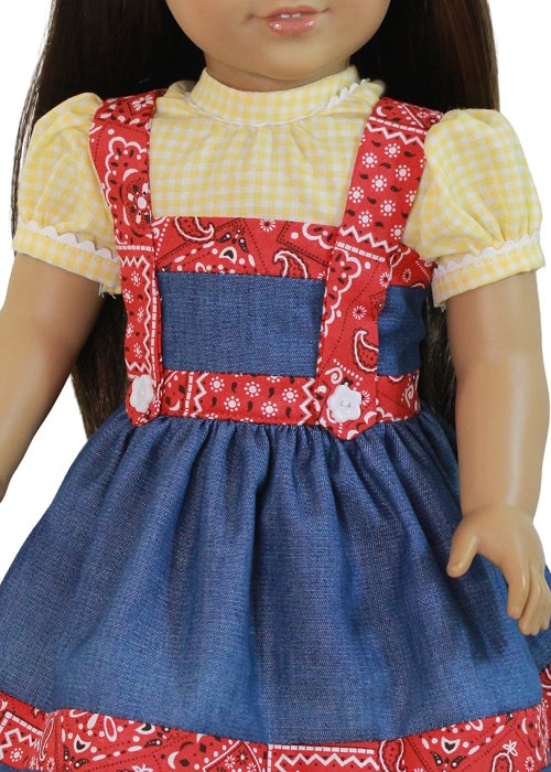 Country style denim dress with red trim and straps. Included is a yellow check blouse that closes with velcro in the back.
